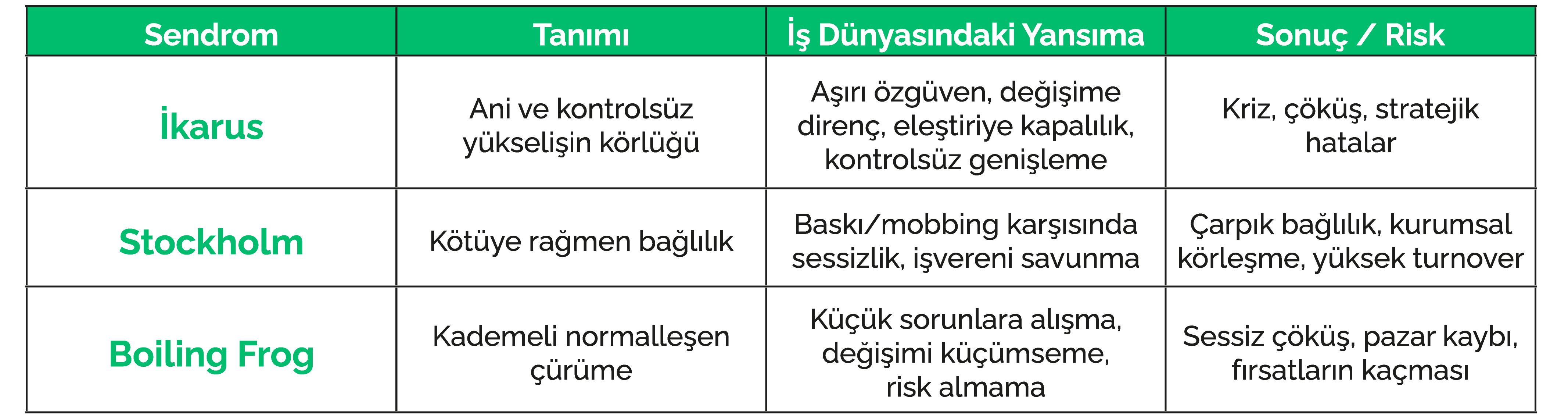 Benzer şekilde, adını yavaş yavaş ısınan bir tencerenin içindeki kurbağanın, sıcaklık artışını fark edememesinden alan ‘kaynayan kurbağa sendromu’ ise fark edilmeyen tehlike olarak tüm patolojilerle beraber kurumsal bünyede kök salabilir. Değişime uyumsuzluk, risk almama korkusu da beraberinde bu, kurumsal yapıda ‘sessiz çöküş’e giden yolun taşlarını döşer. Her günkü küçük problemler, birikerek büyük ve çözülmesi zor bir krize dönüşür.